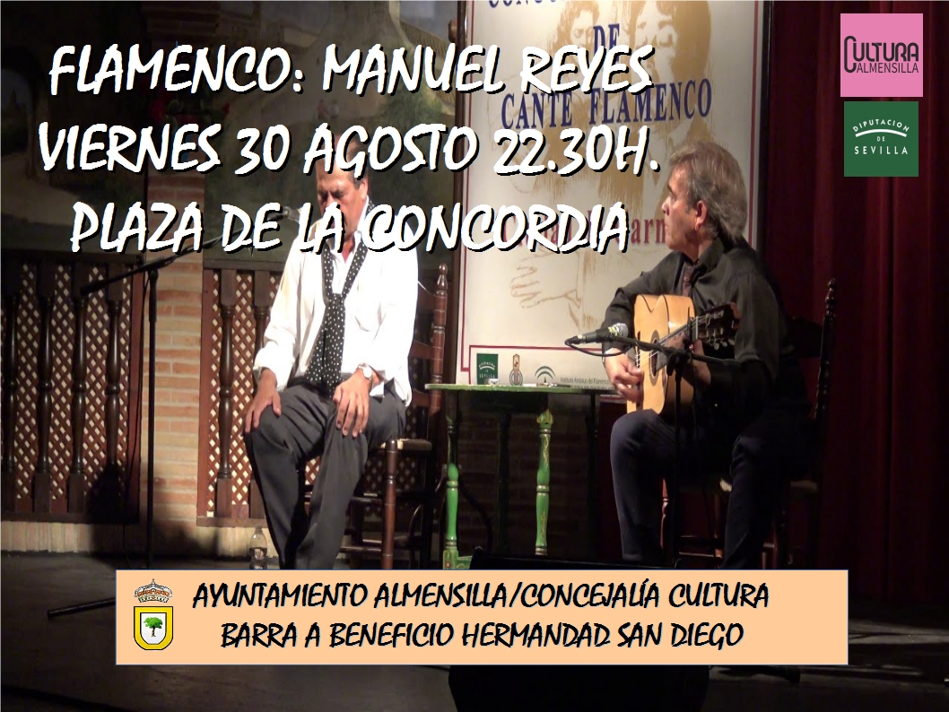 El próximo viernes 30 de agosto vendrá a la Plaza de la Concordia el gran cantaor de Pilas y afincado en Huévar del Aljarafe Manuel Reyes.