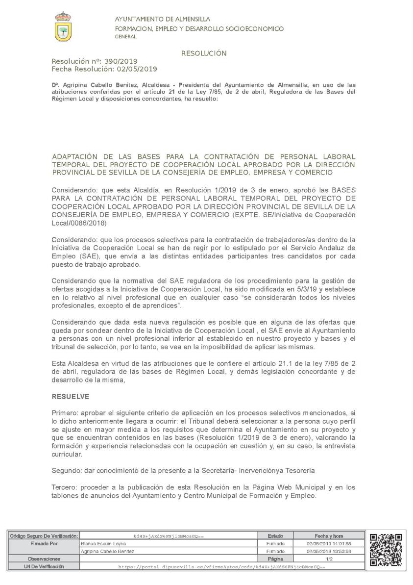 Adaptación de las Bases para la contratación de personal laboral temporal del proyecto de Cooperación Local