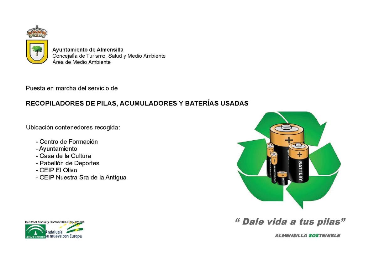 Se informa a la población, que dentro de la campaña de sensibilización ambiental que estamos desarrollando, 'Almensilla SOStenible', implicados/as en el proceso para cumplir los objetivos de protección y mejora del medio ambiente, hemos puesto en marcha el servicio de recopiladores de pilas, acumuladores y baterías usadas , cumpliendo con el Real Decreto 110/2015.