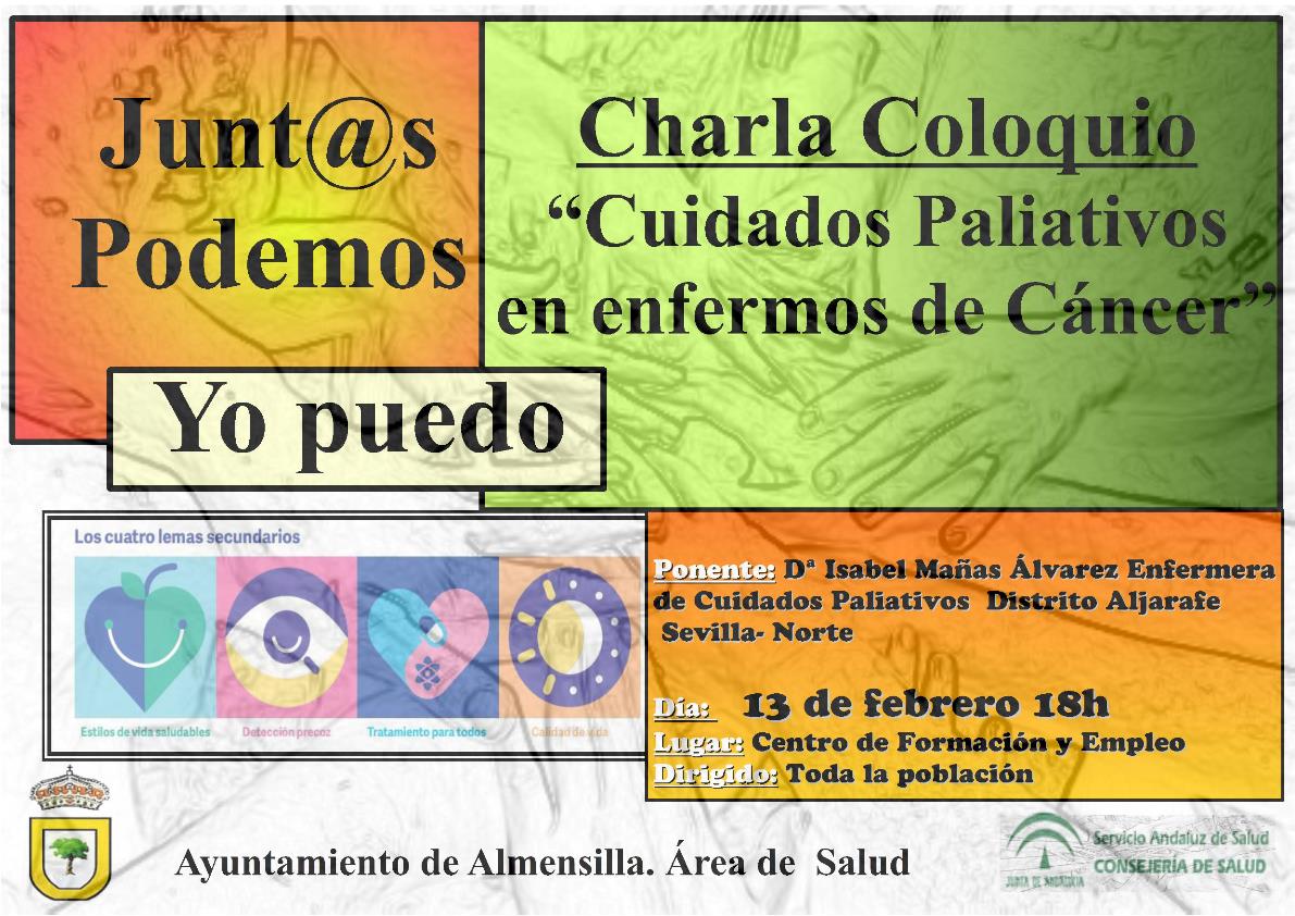 Desde la Concejalía de Salud del Ayuntamiento de Almensilla, queremos informar a la ciudadanía que el próximo día 13 de febrero a las 18h habrá una Charla informativa sobre 'Cuidados Paliativos en Enfermos de Cáncer”.