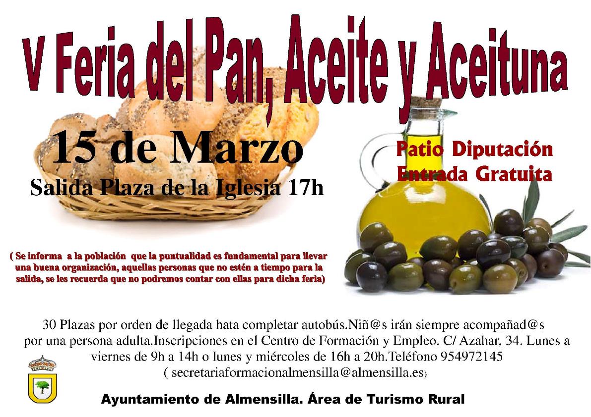Con motivo de la V Feria del pan, aceite y aceituna, en la provincia de Sevilla en el Patio de la Diputación, la Concejalía de Turismo, Salud y Medio Ambiente pone a disposición de la población un autobús gratuito para el día 15 de marzo con salida desde Plaza de la Iglesia a las 17:00h , las inscripciones se realizarán por orden de llegada a través del teléfono 954972145 o email secretariaformacionalmensilla@almensilla.es.