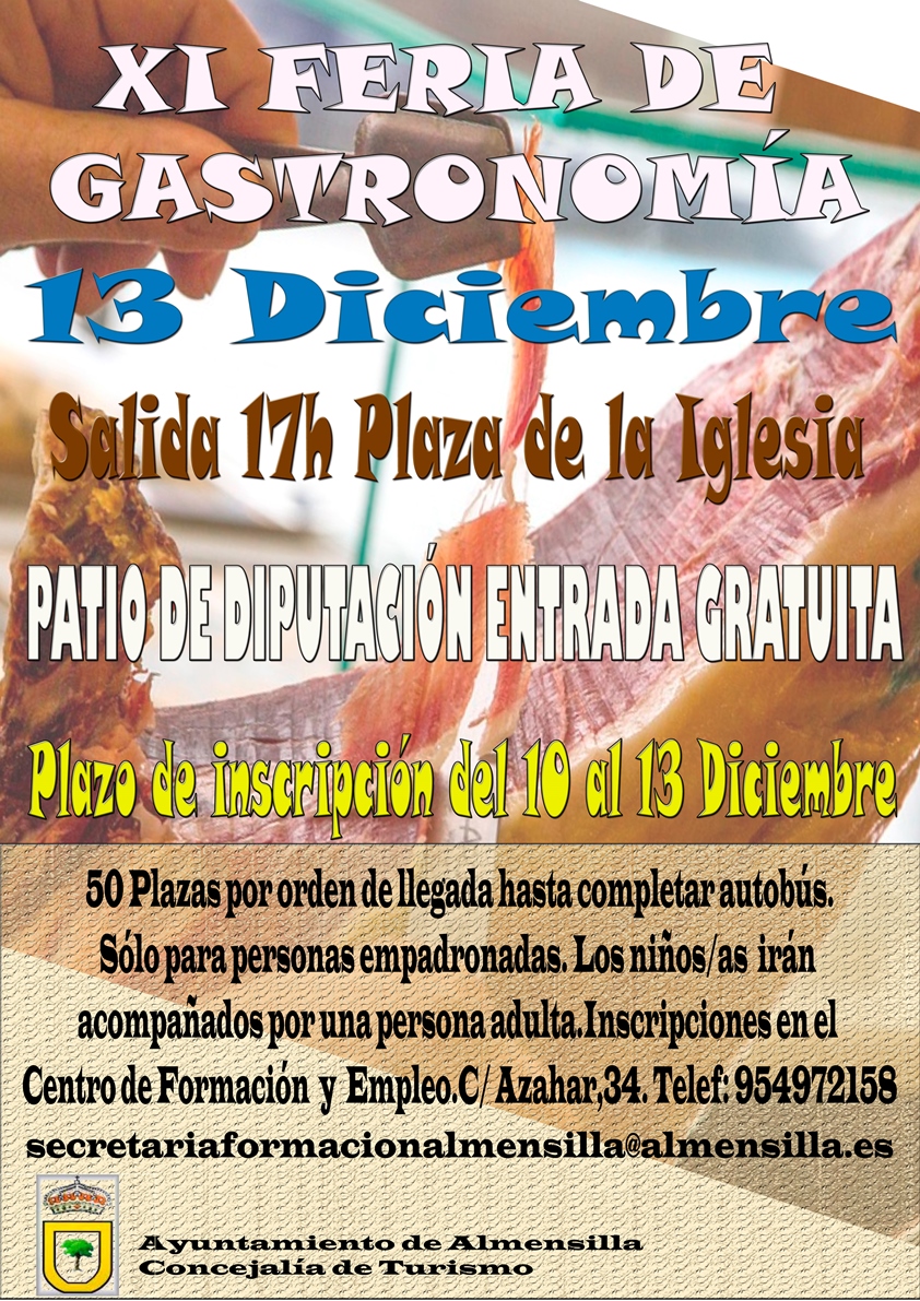 Con motivo de la XI Feria de la Gastronomía en la Provincia de Sevilla en el Patio de la Diputación, la Concejalía de Turismo y Fiestas Locales pone a disposición de la población un autobús gratuito para el día 13 de diciembre , las inscripciones se realizarán por orden de llegada a través del teléfono 954972158 o email secretariaformacionalmensilla@almensilla.es.