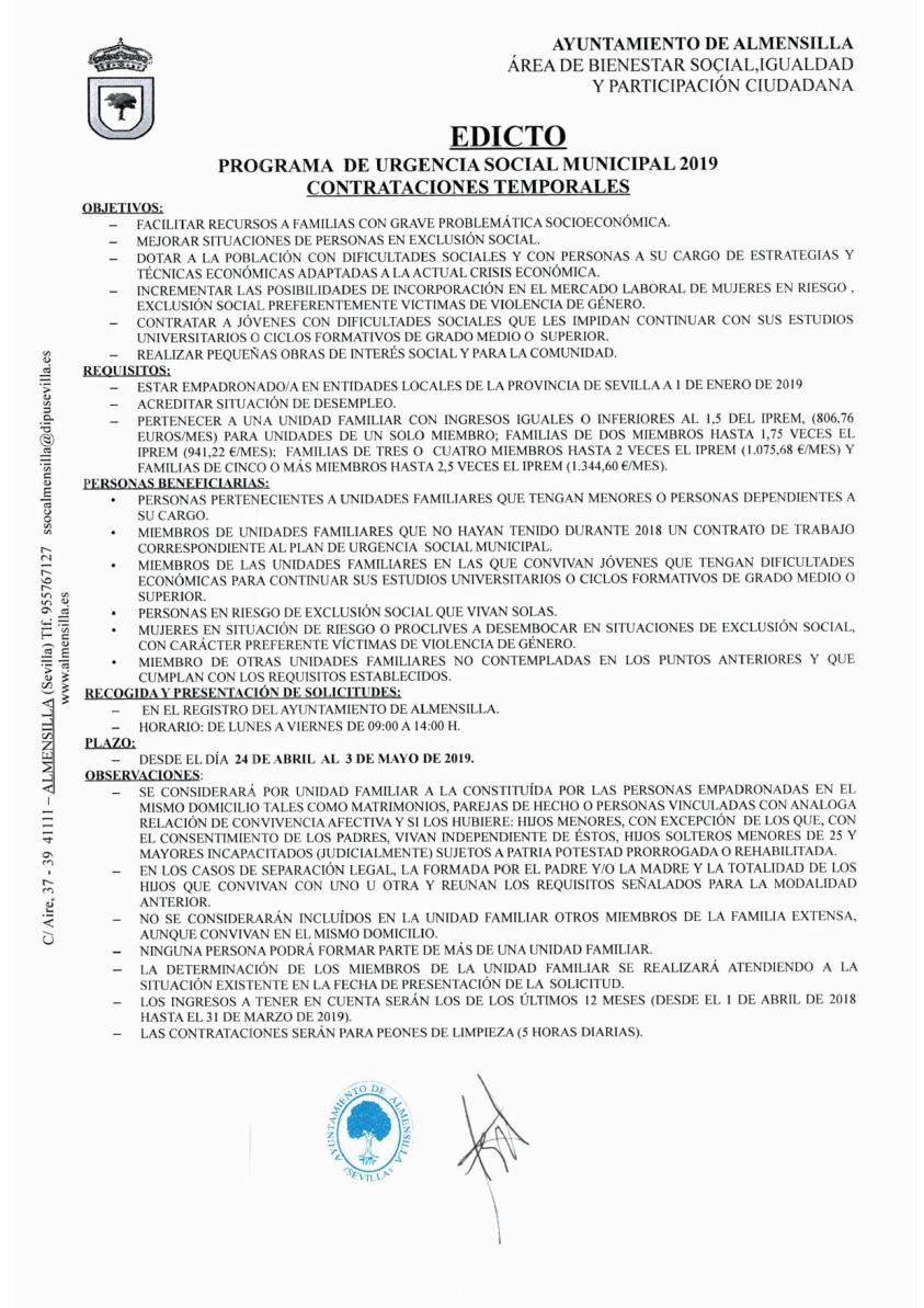 Programa de Urgencia Social Municipal 2019. Contrataciones temporales