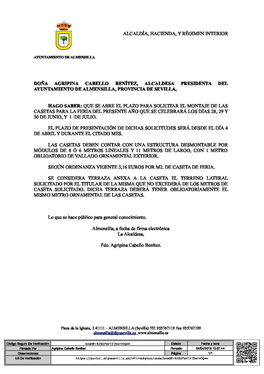 Se informa del plazo de presentación de solicitudes para el montaje de casetas para la Feria de Almensilla 2018, así como de las características de la estructura de las mismas.