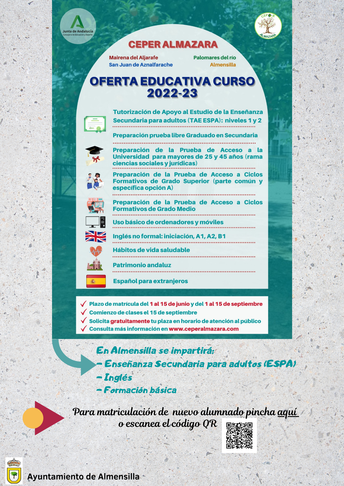 Informamos de la nueva oferta educativa para el curso 2022-2023 de Ceper Almazara y en concreto la que se va a impartir en el Centro de Formación municipal de Almensilla: