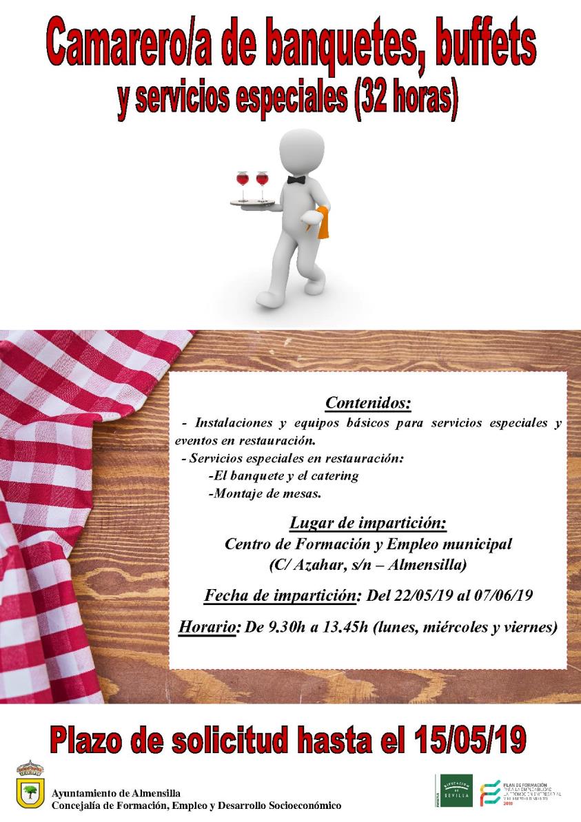 Hasta el próximo 15 de mayo estará abierto el plazo de solicitudes para el nuevo curso 'Camarero/a de banquetes, buffets y servicios especiales' que se impartirá por Prodetur en el Centro de Formación y Empleo de Almensilla.