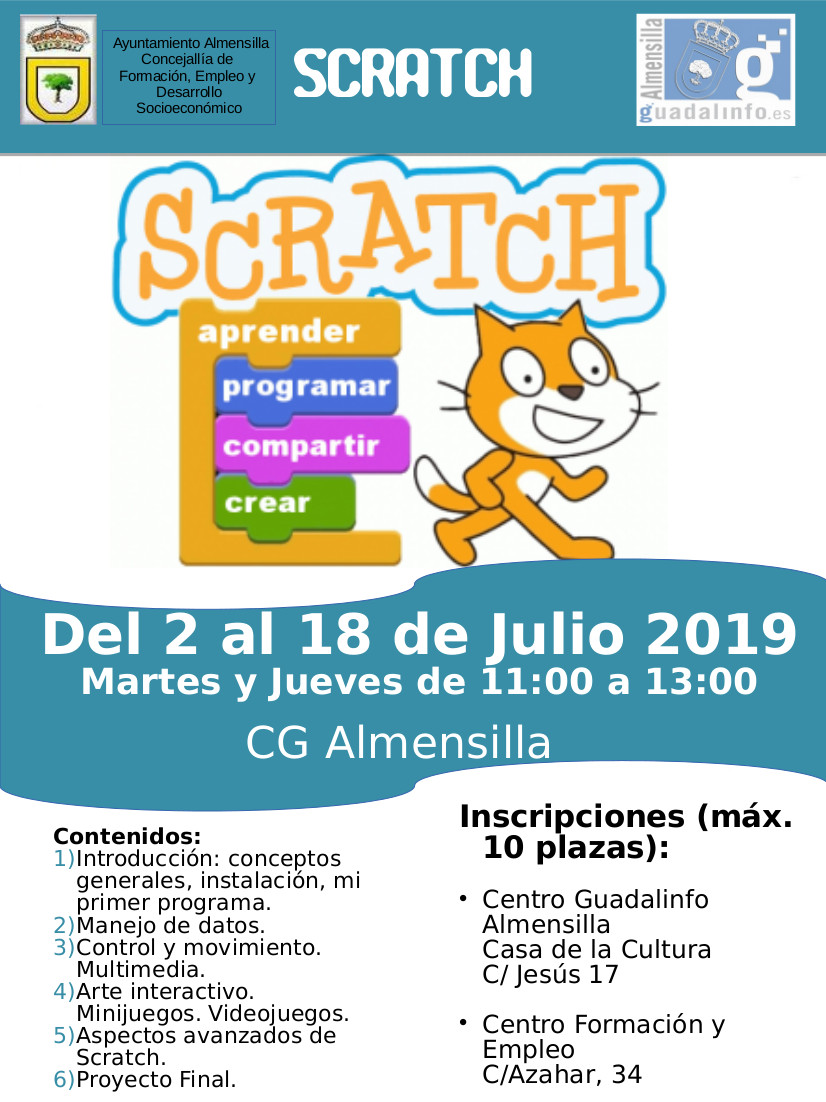 - Taller Scratch: programación para niños y jóvenes de 8 a 16 años. Del 2 al 18 de julio de 2019. Martes y Jueves de 11 a 13 h.