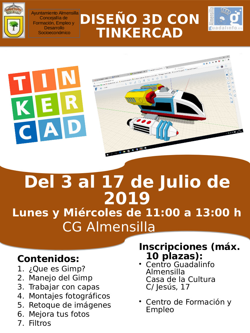 - Taller Diseño 3D con Tinkercad: para niños de 8 a 16 años . Del 3 al 17 de julio de 2019. Lunes y Miércoles de 11 a 13 h.