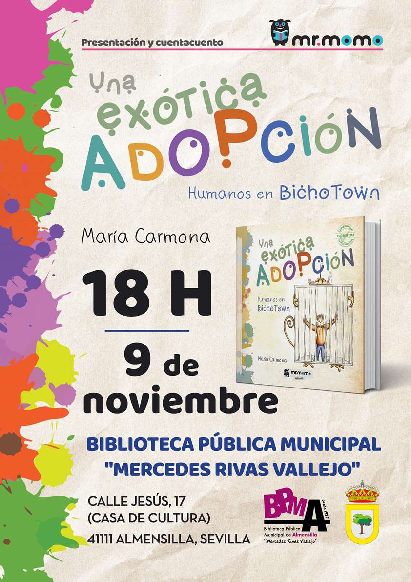 El próximo viernes 9 de noviembre se llevará a cabo en la Biblioteca Municipal de Almensilla la presentación del libro infantil ‘Una exótica adopción’ , con CuentaCuento incluido por parte de la propia autora María Carmona. A la finalización de la actividad todas las personas que lo deseen podrán adquirir in-situ el libro y llevárselo a casa firmado si lo desean.