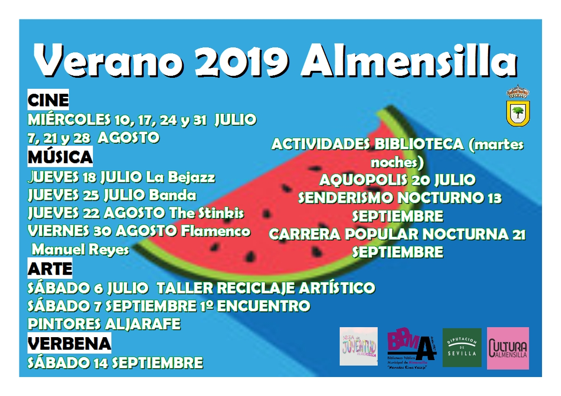 Para este verano la Concejalía de Cultura tiene una variada programación de Cine, Música y con novedades como el Taller infantil de reciclado artístico y el Encuentro de pintores del Aljarafe, sin olvidar la IV Verbena Popular 'Villa de Almensilla' que será en septiembre como el año pasado.