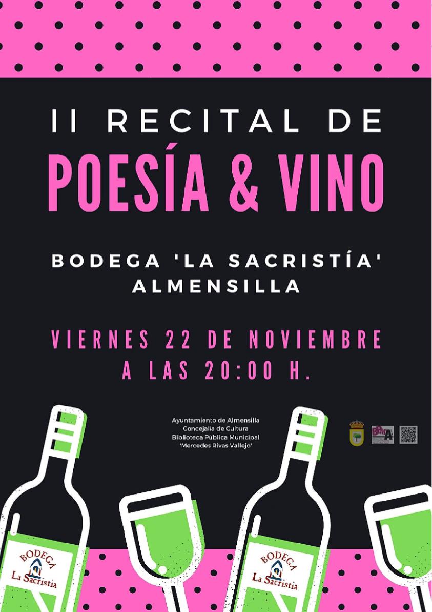 El próximo viernes 22 de noviembre la Biblioteca Municipal de Almensilla llevará a cabo un nuevo Recital de Poesía y Vino. En esta ocasión y por segundo año consecutivo se realizará en la Bodega ‘La Sacristía’ de Almensilla.